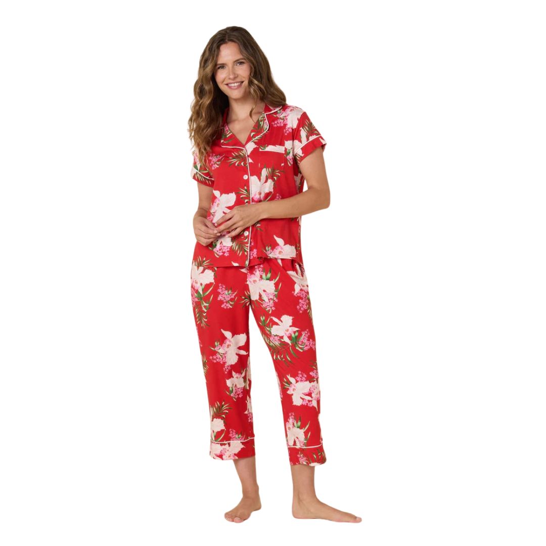 - Short-Sleeved pajama top and capri-length pant with pockets