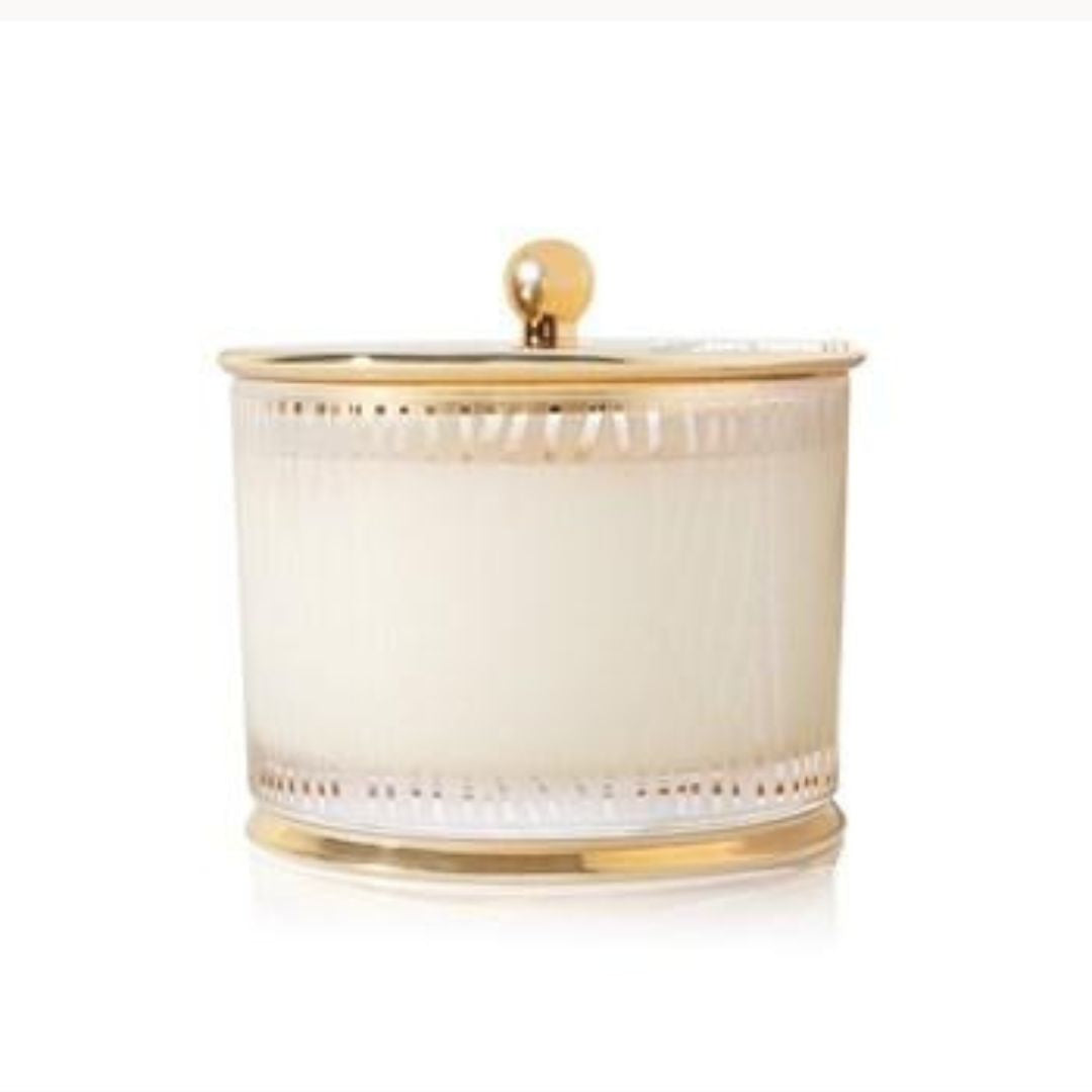 Accented with a glistening gold lid and gilded gold base, this elegant and luminous frosted wood grain candle is the perfect way to experience Frasier Fir.