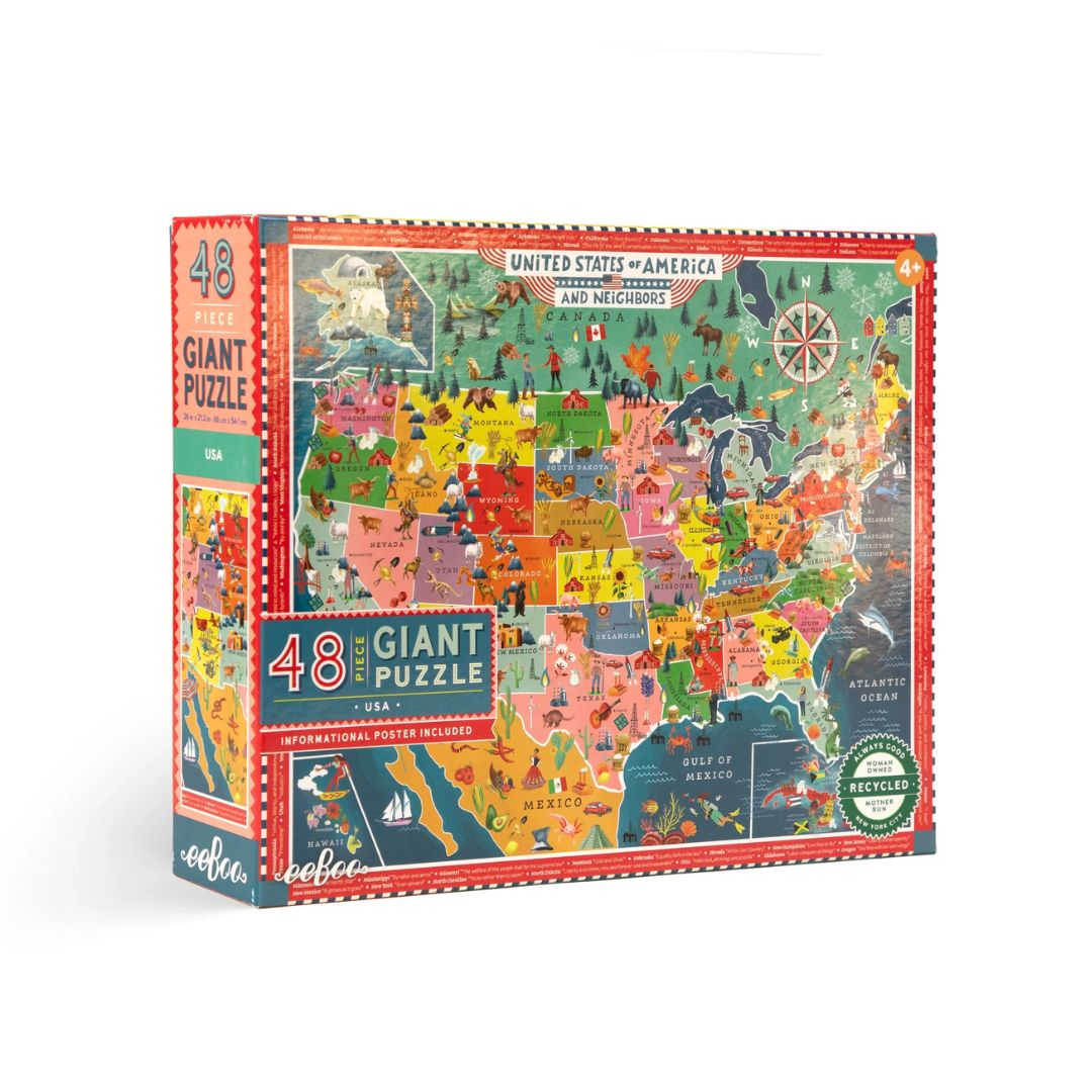 A carefully researched and beautifully designed pictorial map of the U.S.A and its neighbors, brimming with icons by Uta Krugmann offering information about natural and cultural landmarks, industry, agriculture, and wildlife. Includes a color poster identifying these icons. An accessible, educational puzzle offering lessons in geography and beyond.