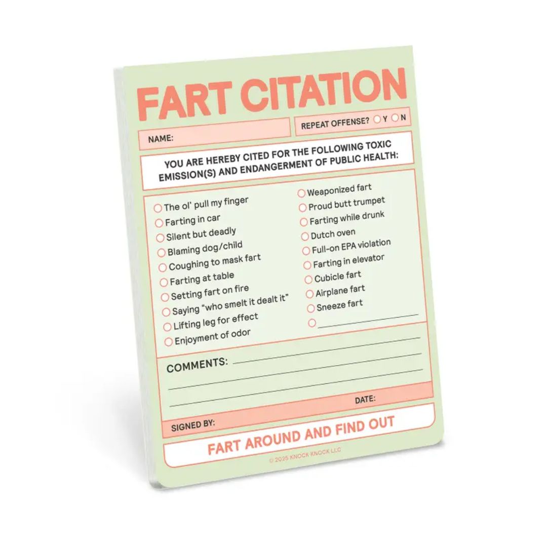 As a responsible citizen it's your duty to police other people's behavior–the good, the bad, and the gassy. Issue this semi-official-ish citation for squeezing the breeze and cutting the cheese, whether offenders are friends, coworkers, loved ones, or total strangers. Do your part to enforce clean-air standards, not to mention good manners!