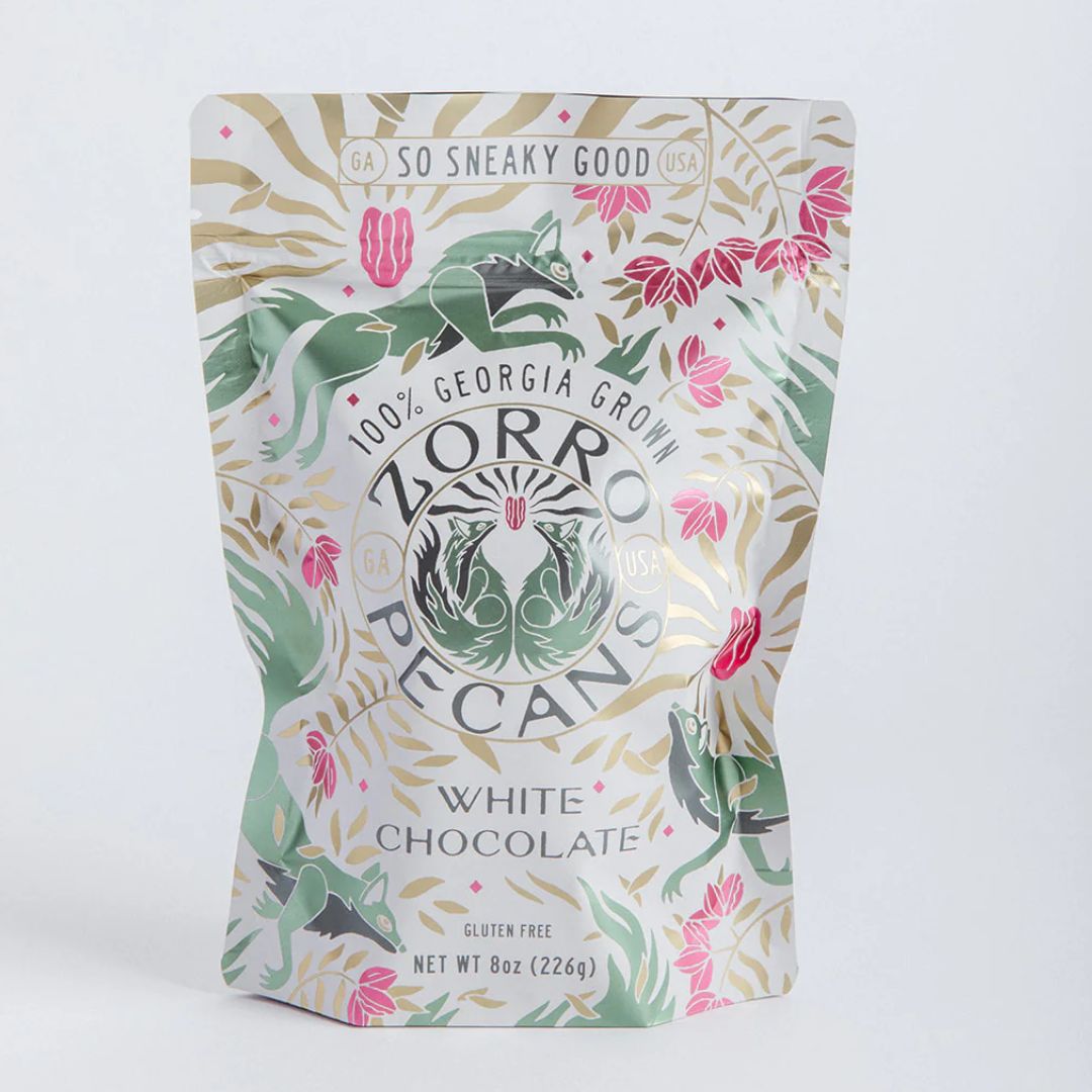 White Chocolate: Holiday flavor - White Chocolate Covered Pecans! The same great pecans you expect from Zorro, but now with an indulgent layer of creamy white chocolate.