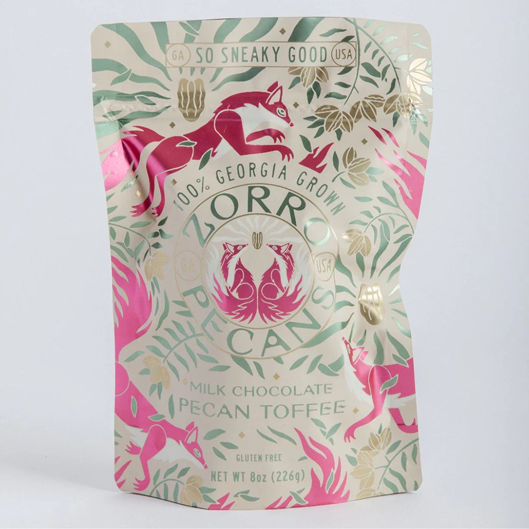Milk Chocolate Toffee: Holiday flavor - Crunchy Pecan Toffee, covered in Milk Chocolate! The same great pecans you expect from Zorro, but built into a crunchy toffee and milk chocolate coating.